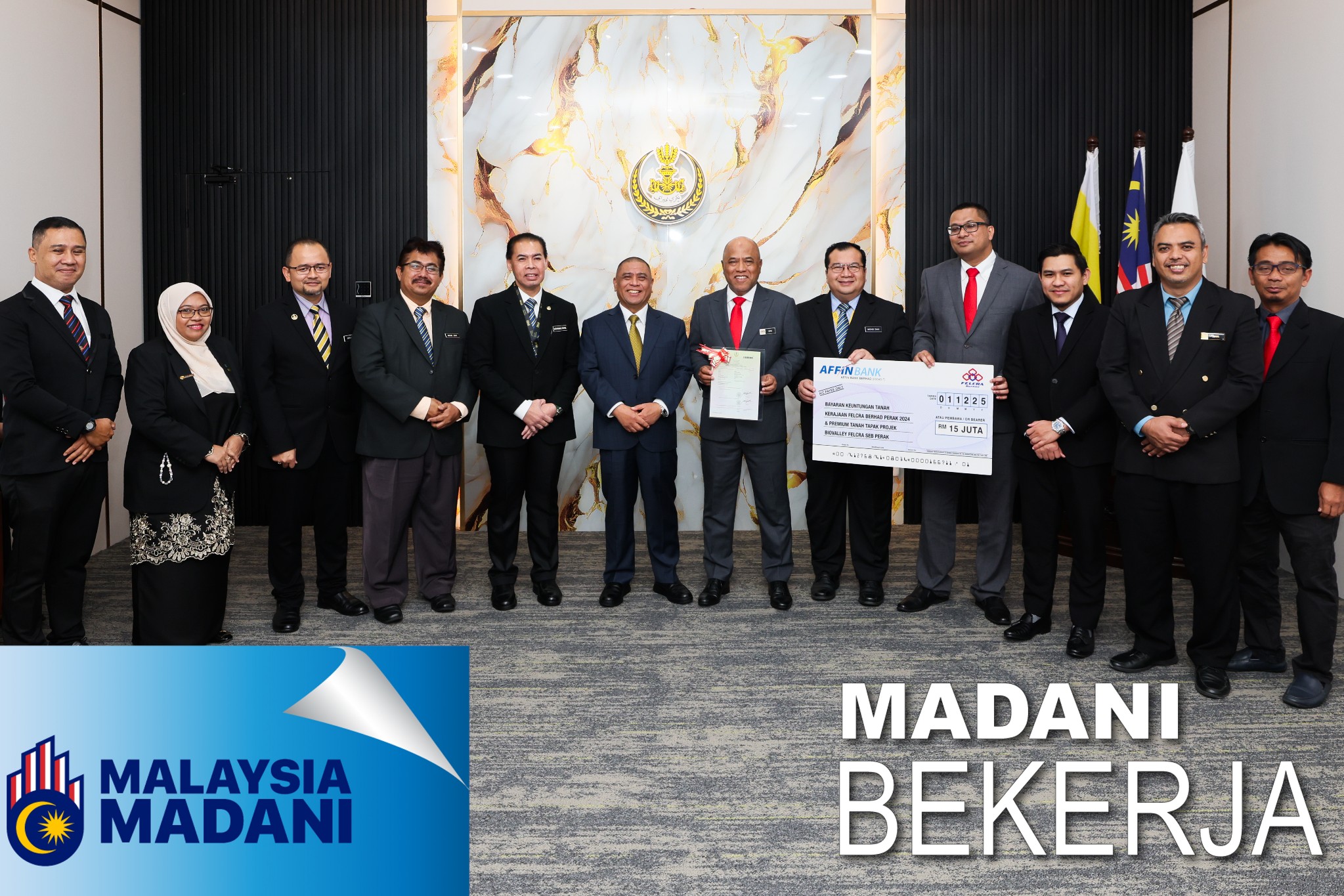 1 12 2025 - Penyerahan Mock Cheque euntungan Tanah Kerajaan Negeri Perak 2024 dan Penyerahan Suratan Hak Milik Tanah Projek FELCRA Bio Valley Seberang Perak daripada YAB Dato' Seri Menteri Besar Perak.