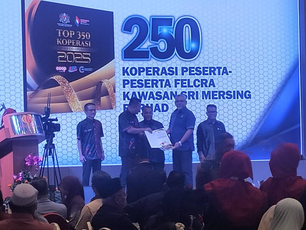 9.10.2025 - Koperasi Peserta FELCRA Sri Mersing Berhad kerana berjaya menduduki Top 350 koperasi terbaik di Malaysia.